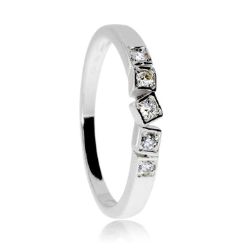Jemný stříbrný prstýnek zdobený pěti diamanty je ozvláštněn asymetrickým detailem na středu. Záře diamantů je nepřehlédnutelná a prsten na sebe bude poutat pozornost, i když je drobný a zdánlivě nenápadný.