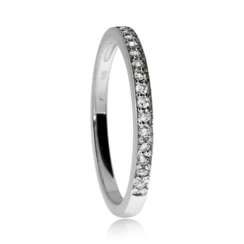 Stříbrný prsten s rhodiovaným povrchem je ozdoben řádkou drobných diamantů SI2/G, které mají v průměru 1,2 mm a celkovou hmotnost 0,11 ct. Diamanty jsou vybroušené do tvaru briliantu a jsou zasazené velmi těsně vedle sebe. Prsten působí dojmem, že je diamanty posázena celá obroučka.