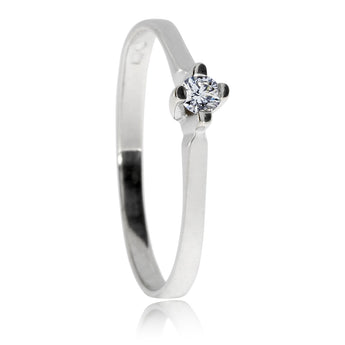 Jemný stříbrný prsten s diamantem o průměru 2,8 mm SI2/G je povrchově galvanizován rhodiem. Tento šperk se výborně hodí jako zásnubní prsten. Diamant je zasazen ve čtyřech krapnách, které kámen chrání a zároveň umožňují přístup světla ze stran.