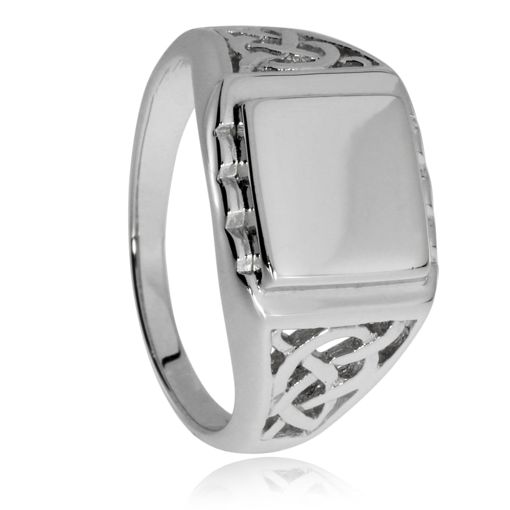 Stříbrný prsten pro muže jo ozdoben lesklou obdélníkovou ploškou v rozšíření obroučky, kterou lze využít na vyrytí např. monogramu. Masívnost prstenu je odlehčena na bocích obdélné tabulky mřížkou s motivem keltských nekonečných uzlů. Ačkoliv prsten na první pohled vyvolává dojem pánského prstene, mohla by si jej pro sebe zvolit i řada žen pro výraznější ozdobení ruky.