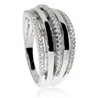 Dámský stříbrný prsten se třemi řádkami drobných kamínků cubic zirconia je skutečně zářivou ozdobou ženské ruky.Prostor mezi řadami kamenů je vyplněn velmi lesklými stříbrnými liniemi. Tento stříbrný šperk je povrchově galvanizován rhodiem, které zůstává stále lesklé a neoxiduje.