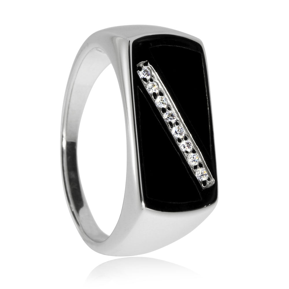 Masívnější stříbrný prsten je určen především pro muže. Je ozdoben větší obdélníkovou ploškou syntetického onyxu bez fazet, do níž je po diagonále vsazeno do řádky osm kulatých kamenů kubické zirkonie briliantového brusu. Kontrast černé barvy onyxu a zářivě čirých zirkonií působí velmi slavnostně. Prsten se více hodí pro výjimečnější příležitost, než na každodenní nošení. Prsteny tohoto typu občas vyhovují i ženám na prostřední prst.