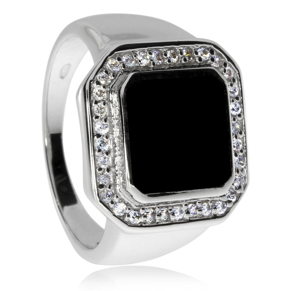 Pánský stříbrný prsten s černým obdélným onyxem a zirkony (cubic zirconia