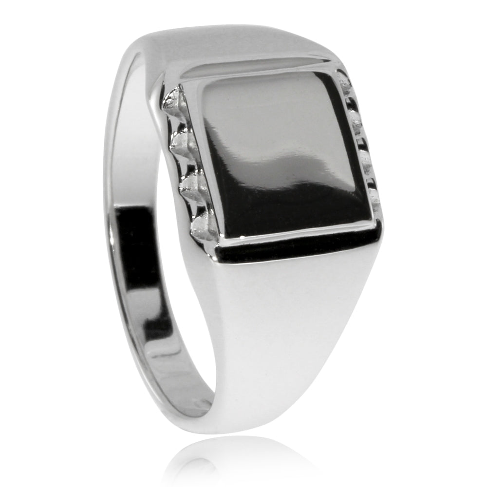 Stříbrný prsten pro muže i ženy na první pohled dělá dojem, že je ozdoben leštěným kamenem v jednoduchém obdélném rámečku. Uprostřed rámečku však není kámen, ale nachází se tam vysoce vyleštěná stříbrná plocha, která je ozdobou sama sebou. Může být využita k vyrytí monogramu nebo symbolu. Tento prsten není příliš vysoký, je hladký a velmi pohodlný pro každodenní nošení. Jeho nenápadná elegance bude vyhovovat mužům, kteří dávají přednost umírněným šperkům. Prsten je více než jeden centimetr široký a na ženské ruce působí výrazněji, než na ruce muže.
