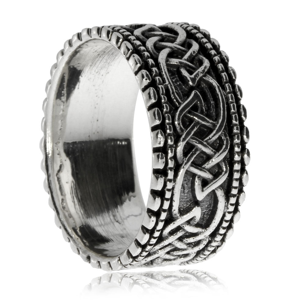 Stříbrný prsten s nekonečnými keltskými uzly je ozdoben jemným vroubkováním na okraji. Celkově starodávný dojem vyvolává kromě motivui i povrchová úprava. Začernalá patina pozadí dává vyniknout vystouplému vzoru - keltským smyčkám. Prsten je vhodný pro muže i ženy.