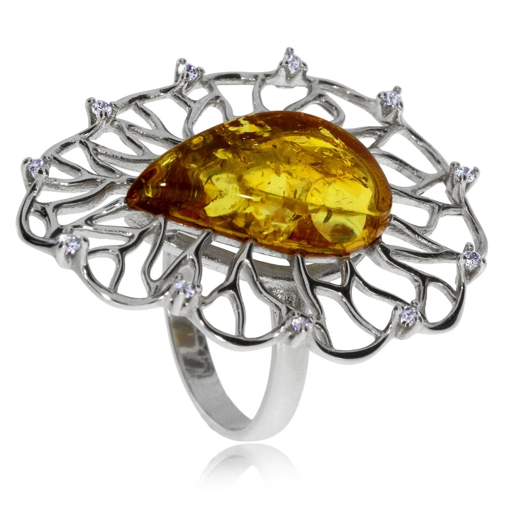Stříbrný šperk s jantarem má velmi nápadný design a tím je určen spíše pro výjimečné společenské příležitosti. Je vyroben ze stříbra 925/1000 s povrchovou galvanizací rhodiem. Středový kámen je přírodní jantar medové barvy ve tvaru kapky. Jantar je zasazen do středu jemné krajkové obruhy, která je zdobena drobnými kamínky kubické zirkonie. Prsten je vyroben tak, že je možné regulovat velikost obroučky podle prstu.