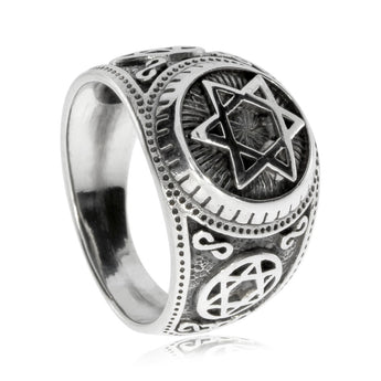 Stříbrný prsten pro muže je masívní a poměrně široký. Jedná se o šperk bez kamenů, ale je bohatě zdoben plastickými reliéfy - symbolickou šesticípou hvězdou v kruhu a znakem nekonečna. Tyto symboly jsou zvýrazněny použitím starostříbrné patiny.