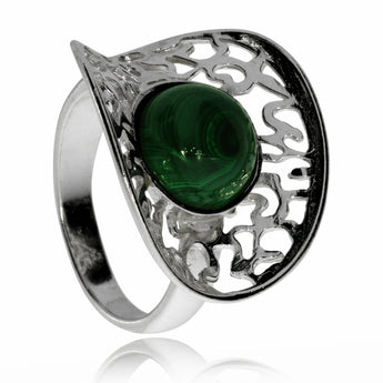 Elegantní stříbrný přívěsek tvaru kapcky je ozdoben drobným přírodním malachitem. Tento šperk bude efektně působit zejména na tmavším jednobarevném podkladu, kdy vyniknou jemné, jakoby krajkové, průřezy ve stříbrném lůžku kamene. Uchycení přívěsku má dostatečně velký průměr i na silnější řetízek.