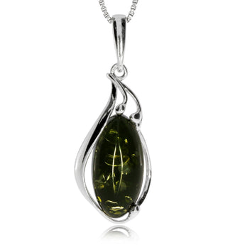 Jantarový přívěsek působivě kombinuje tmavou nazelenalou barvu s leskem rhodiovaného stříbra. Nazelenalý efekt baltského jantaru je dosažen dodatečnou úpravou přírodního kamene - potřením spodní strany šperkového kamene pryskyřicí černé barvy. Barva jantaru dosažená touto úpravou je velmi oblíbená a nezasahuje nijak do podstaty kamene. Přívěsek má podlouhlý tvar s délkou téměř 4 cm a je decentně ozdoben nepravidelnými liniemi, které přívěsku dodávají neobyčejnou lehkost a hravost.