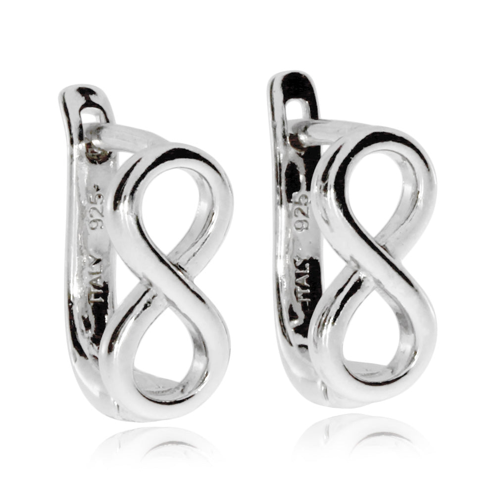 Náušnice ze stříbra zdobí atraktivní symbol nekonečna. Náušnice mají spolehlivé zapínání na anglický patent a velmi lesklý povrch, který nebude měnit barvu ani se pokrývat matným oxidačním povlakem, protože je šperk na povrchu pokryt lesklám rhodiem.
