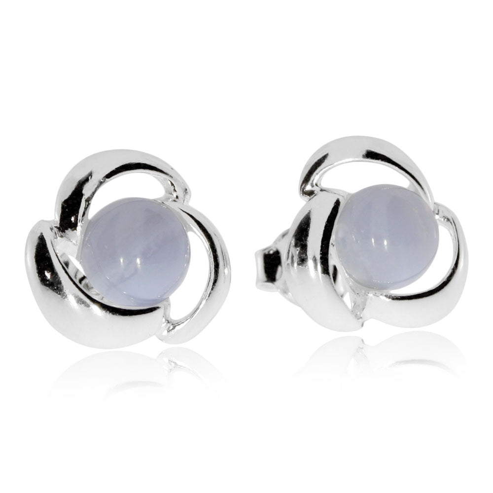 Půvabné stříbrné náušnice pecičky ve tvaru jednoduchých kytiček nesou ve svém středu namodralý přírodní chalcedon ve tvaru kulatého kabošonu. Náušnice mohou být elegantním doplňkem pro každodenní příležitost.