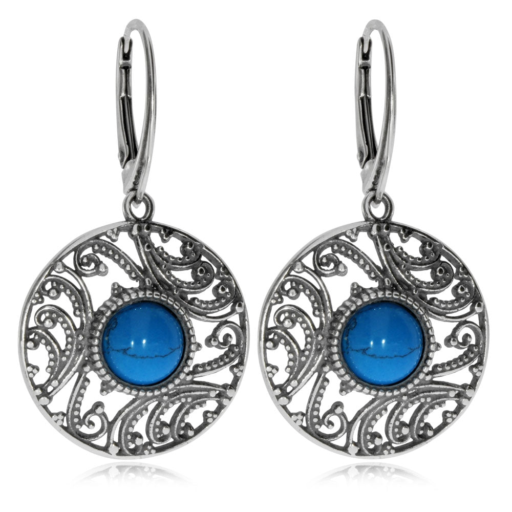 Nápadné delší náušnice z patinovaného stříbra upoutají pozornost kulatými přívěsky, v jejichž středu je tyrkysově modrý kámen z rekonstruovaného tyrkysu. Náušnice se velmi dobře hodí pro významnější společenské příležitosti.