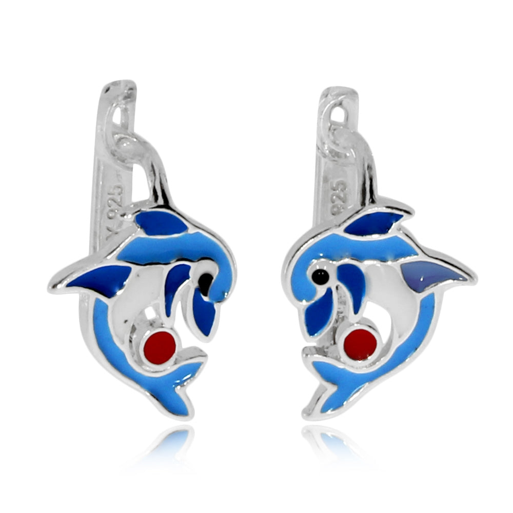 Pěkné náušnice pro malé holčičky jsou vyrobené ze stříbra o ryzosti 925/1000 a jsou ručně dekorované barvami. Modrý delfín si radostně hraje s červeným míčkem. Náušnice mají spolehlivý patentní uzávěr.
