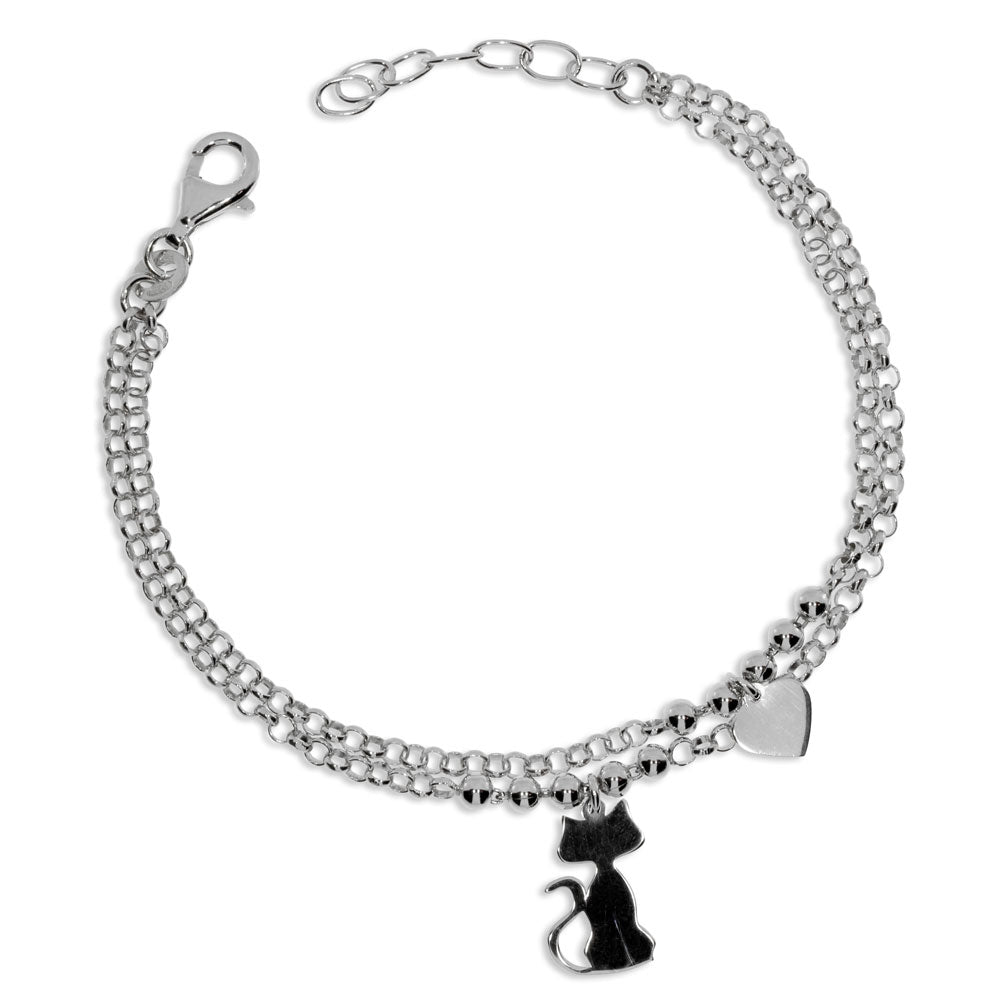 Stříbrný náramek řetízkový s kočkou a srdíčkem