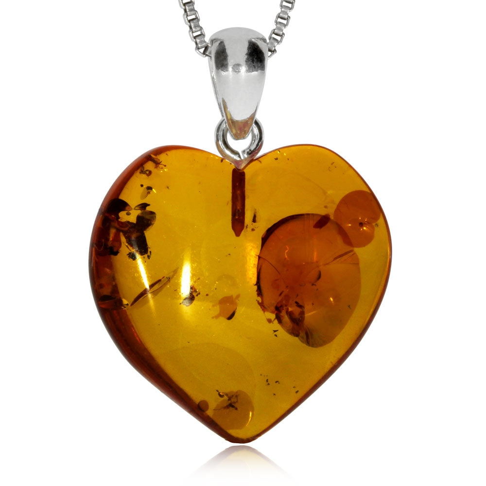 Přívěsek z jantaru ve tvaru vypouklého srdce má leštěný stříbrný úchyt. Jantarový přívěsek je velmi pěkně vytvarován a je bez jakékoliv obruby. Takto vytvořený šperk dává vyniknout kráse jantaru v plné míře, ale zároveň je třeba jantar opatrovat, aby nedošlo k jeho poškození. Jako šperkový kámen rostlinného původu je velmi měkký a není odolný vůči působní chemických látek a to včetně parfému. Poškrábáním nebo zmatovatěním povrchu potom šperk ztrácí svoji krásu. Při jeho používání pro společenské příliežitosti a snímání na mytí a spaní, při občasném přeleštění suchým flanelovým hadříkem, bude pěkný dlouhá léta.
