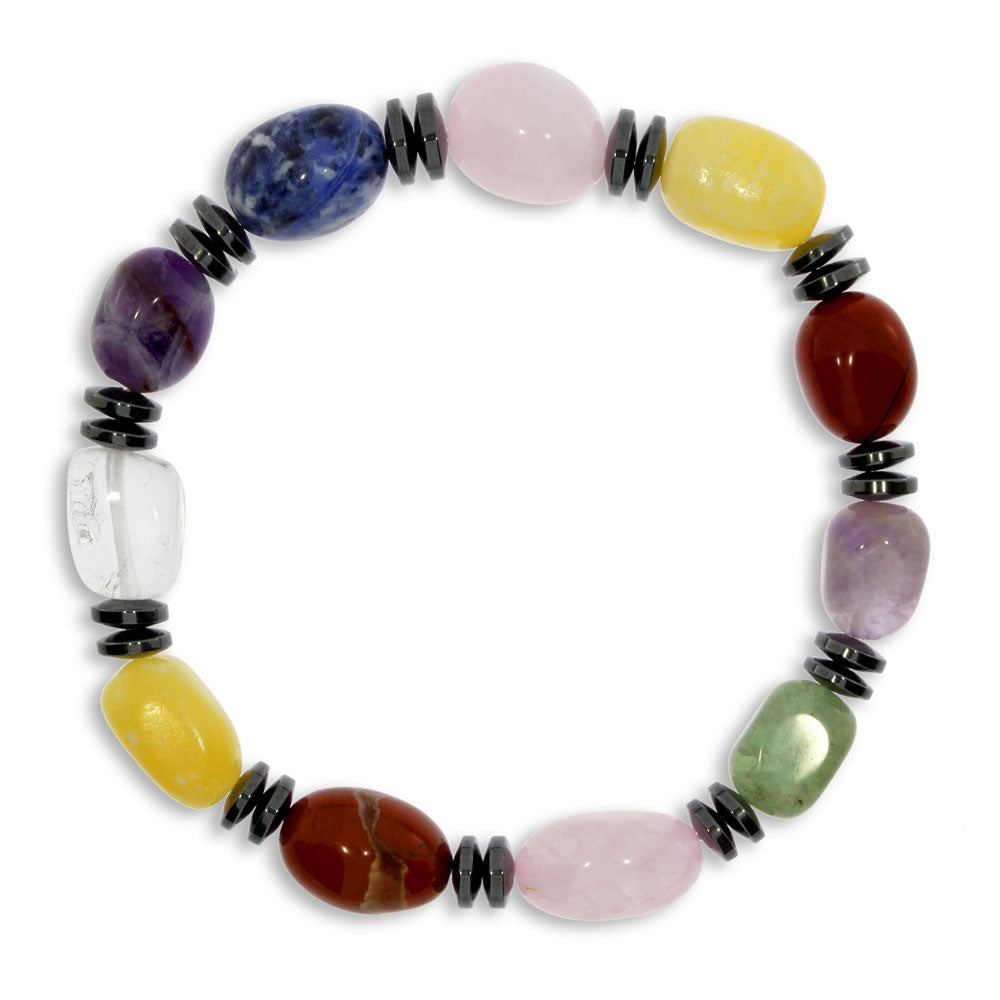 Dámský náramek na pružném návleku tvoří malé oválky přírodních kamenů - růženínu, ametistu, jaspisu, achátu, soalitu a křištálu, které jsou proloženy drobnými disky z hematitu, tzv. slavíky. Náramek je vhodným doplňkem k neformálnímu oblečení. Dárováním tohoto náramku uděláte radost milovnicím přírodních kamenů.
