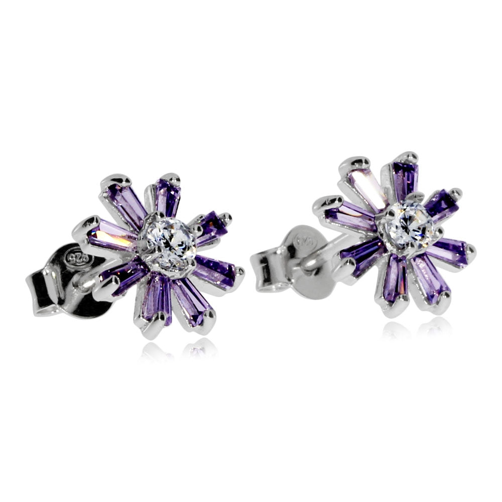 Dámské stříbrné náušnice ve tvaru drobných kytiček mají jemně fialovou barvu okvětních lístků s bílým středem. Broušené kamínky kubické zirkonie mají tvar podlouhlých bagetek a uprostřed jsou vybroušené do kulatého briliantového brusu. Náušnice mají zapínání na puzety a jsou vhodné pro denní nošení jako drobný barevný doplněk.