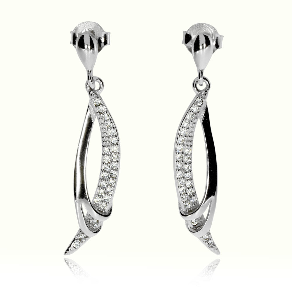 Dámské stříbrné náušnice pro slavnostnější chvíle se pyšní delšními přívěsky. Elegantní esovité linie jsou osazené drobnými kamínky kubické zirkonie, které se půvabně třpytí. Zapínání náušnice je na puzety. Šperk je vyroben ze stříbra o ryzosti 925/1000, které je na povrchu pokryté rhodiem.
