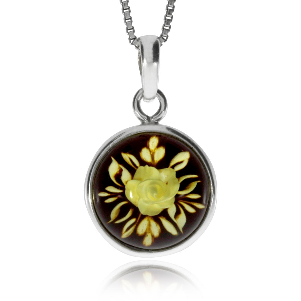 Stříbrný přívěsek - Kulaltý jantar s glyptikou růže