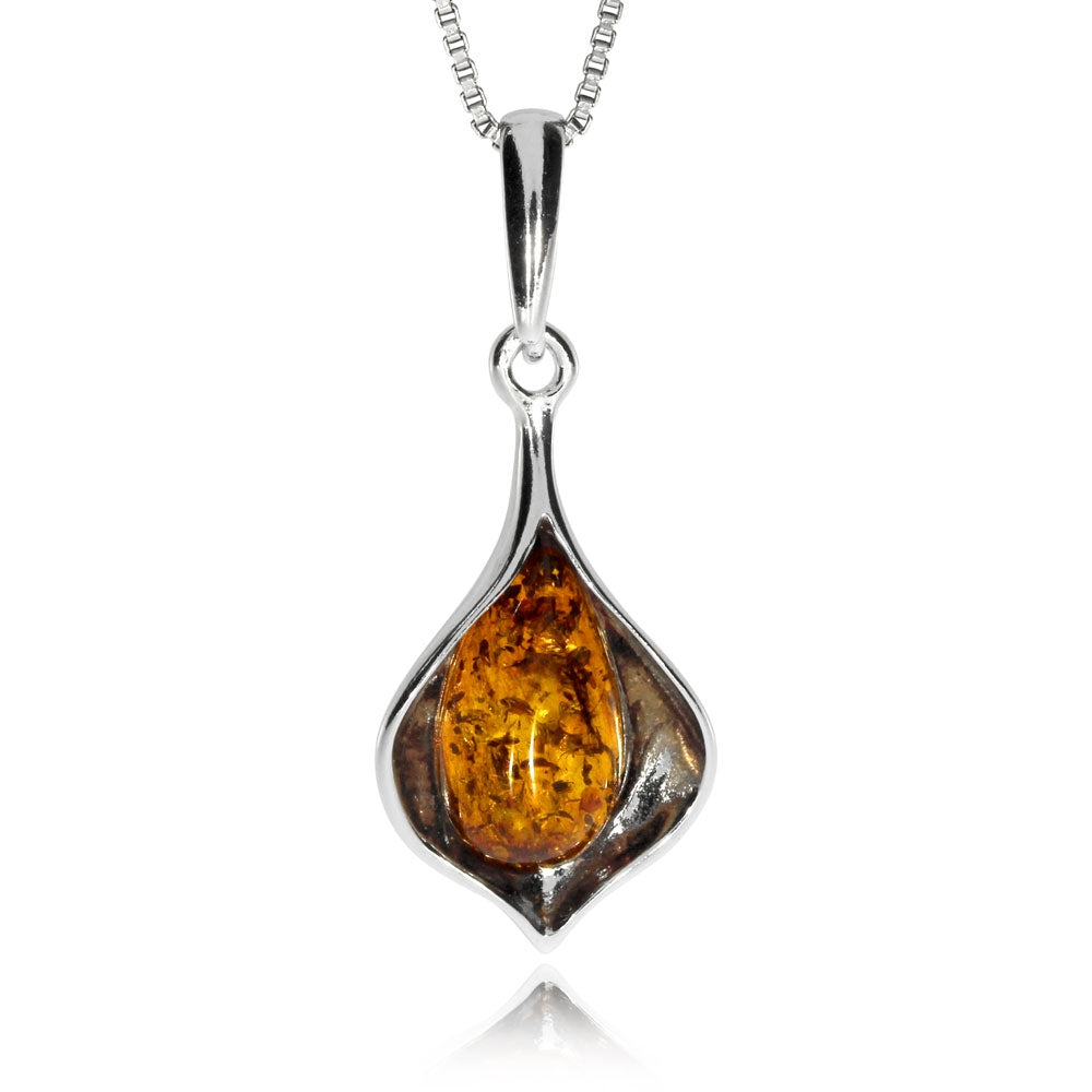 Dámský stříbrný přívěsek na delším úchybu má elegantní tvar kapky. Stříbrné lůžko nese baltský jantar medové barvy.