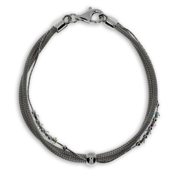 Nádherný dámský náramek, který v sobě krásně spojuje moderní zpracování a jemně třpytivou zdobnost křišťálových krystalů. Jednoduchý design je tvořený dvěma kulatými spletenými stříbrnými vlákny, do kterých je navíc vpletený ozdobný řetízek s krystaly. Celkový motiv potom dotváří zdobná lesklá kulička na středu. Náramek je vyrobený z odolného a pěkně lesklého rhodiovaného stříbra a spolu s ním najdete v naší nabídce také náhrdelník, se kterým tvoří sadu.