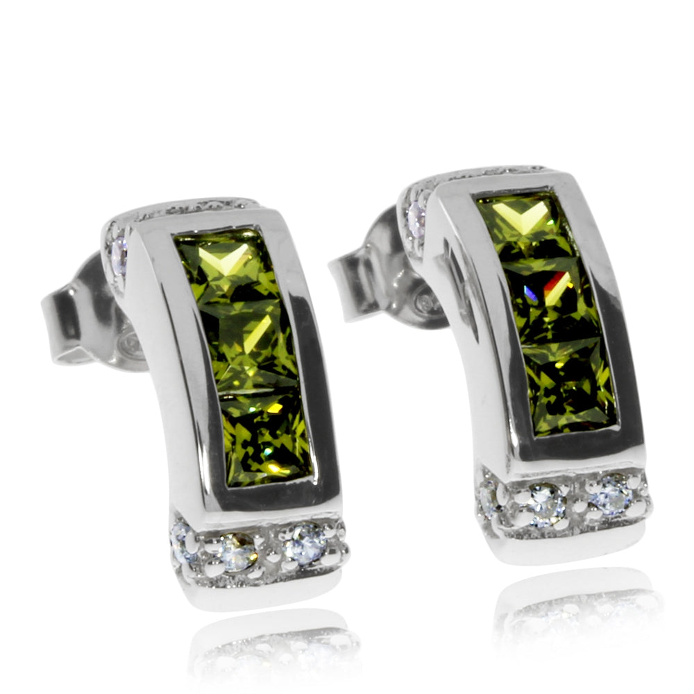Překrásné náušnice s jednoduchým a zároveň pěkně zdobným designem ocení každá dáma se zálibou v nadčasové eleganci. Základem šperku jsou tři čtvercově broušené zirkony (cubic zirconia) zelené barvy, které vytvářejí ozdobný proužek. Linie šperku je potom na obou koncích i na boční straně ozdobená čirými syntetickými zirkony. Náušnice jsou vyrobené z odolného a skvěle lesklého rhodiovaného stříbra.