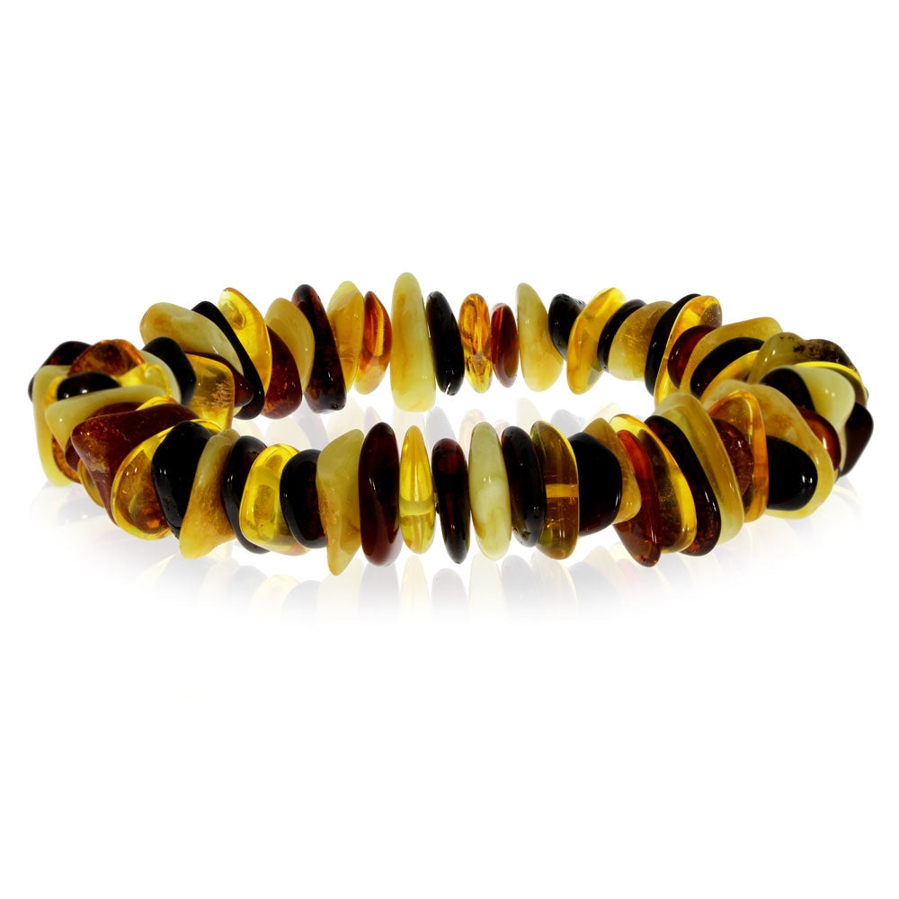 Jantarové šperky jsou velice oblíbené pro své netradiční kouzlo a neobyčejný půvab. Tento dámský jantarový náramek nese na pevné a pružné gumičce různě barevné kousky jantaru.
