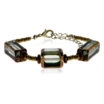 Bižuterní šperky umožňují nejrůznější variace a velice kreativní práci s materiály. Nejpoužívanějším je potom sklo, jeho výroba a úprava má u nás ostatně dlouho tradici. Tento krásný náramek je tvořený drobnými kuličkami se zlatavým leskem a třemi ručně zpracovanými obdélníkovými ozdobami. Spolu s ním najdete v naší nabídce také náhrdelník a náušnice, se kterými tvoří sadu.