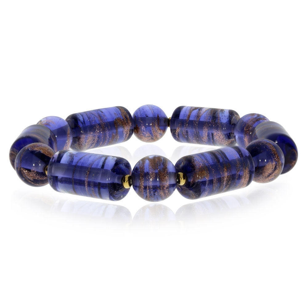 Okouzlující dámský náramek se skvěle hodí pro ženy a dívky, které mají přísné nároky na nápaditost a originalitu. Náramek nese na pružné a pevné gumičce fialové skleněné ozdoby ve tvaru válečků a kuliček, které ozvláštňuje zlatavé zdobení uvnitř skla. Všechny ozdoby jsou ručně zpracované. Náramek je součástí sady, která obsahuje také náhrdelník.