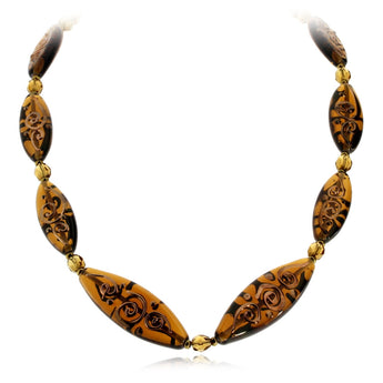 Okouzlující dámský náhrdelník, který dává skvěle vyniknout každému detailu svého designu. Náhrdelník je vyrobený z ručně zpracovaných skleněných ozdob v hnědé barvě, které doplňuje jemné povrchové zdobení.