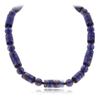 Překrásný dámský náhrdelník budou skvělou ozdobou nejen pro ženy a dívky se zálibou ve fialové barvě. Náhrdelník tvoří ručně zpracované kulaté a válcovité kusy skla, ve kterých vyniká zlatavý efekt. Spolu s náhrdelníkem najdete v naší nabídce také náramek se stejným designem, společně vytvářejí krásnou bižuterní sadu.