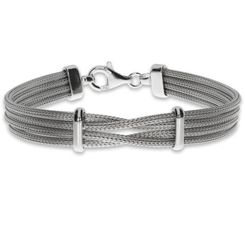 Originální a moderně zpracovaný dámský náramek v sobě spojuje jednoduchou a nadčasovou eleganci a nápaditý design. Tento druh šperků se v italštině nazývá calza a tvoří ho kulaté pleteniny utkané ze stříbrných nití. Čtyři řady tohoto zářivého tkaniva se ve středu kříží, a vytvářejí tak zdobný prvek. Náramek je vyrobený z rhodiovaného stříbra a spolu s ním najdete v naší nabídce také náhrdelník se stejným motivem.