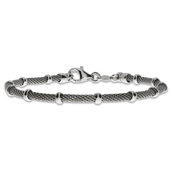 Originální dámský náramek je tvořený kulatým a dutým vláknem, které je utkané ze stříbrných nití. Vzniká tak zajímavý ozdobný řetízek, který doplňjí lesklé kuličky, na kterých dobře vyniká zářivý rhodiovaný povrch stříbra.
