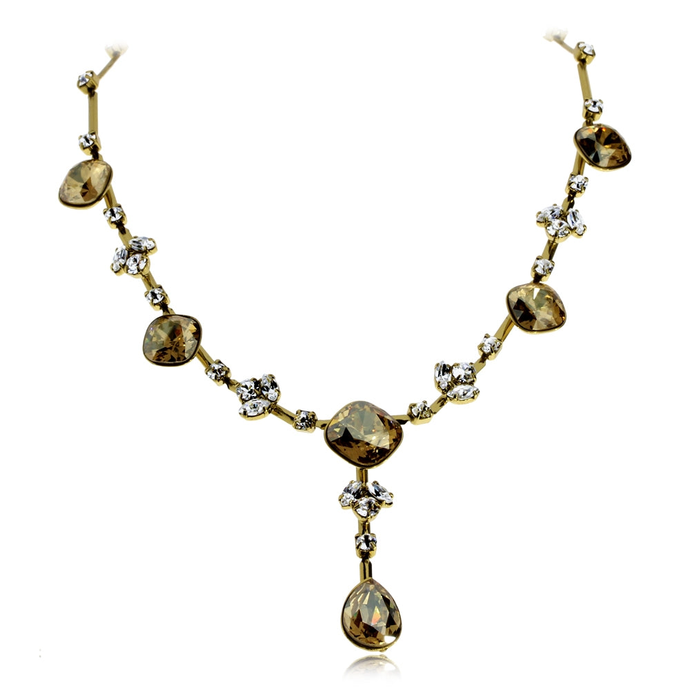 Skvostný dámský náhrdelník, který zaujme svým půvabným třpytem a neotřelou kombinací křišťálových kamenů v různých tvarech a čiré a champagne barvě. Spolu s náhrdelníkem najdete v naší nabídce také náušnice ve stejném designu, snadno si tak vytvoříte nádhernou šperkařskou sadu.
