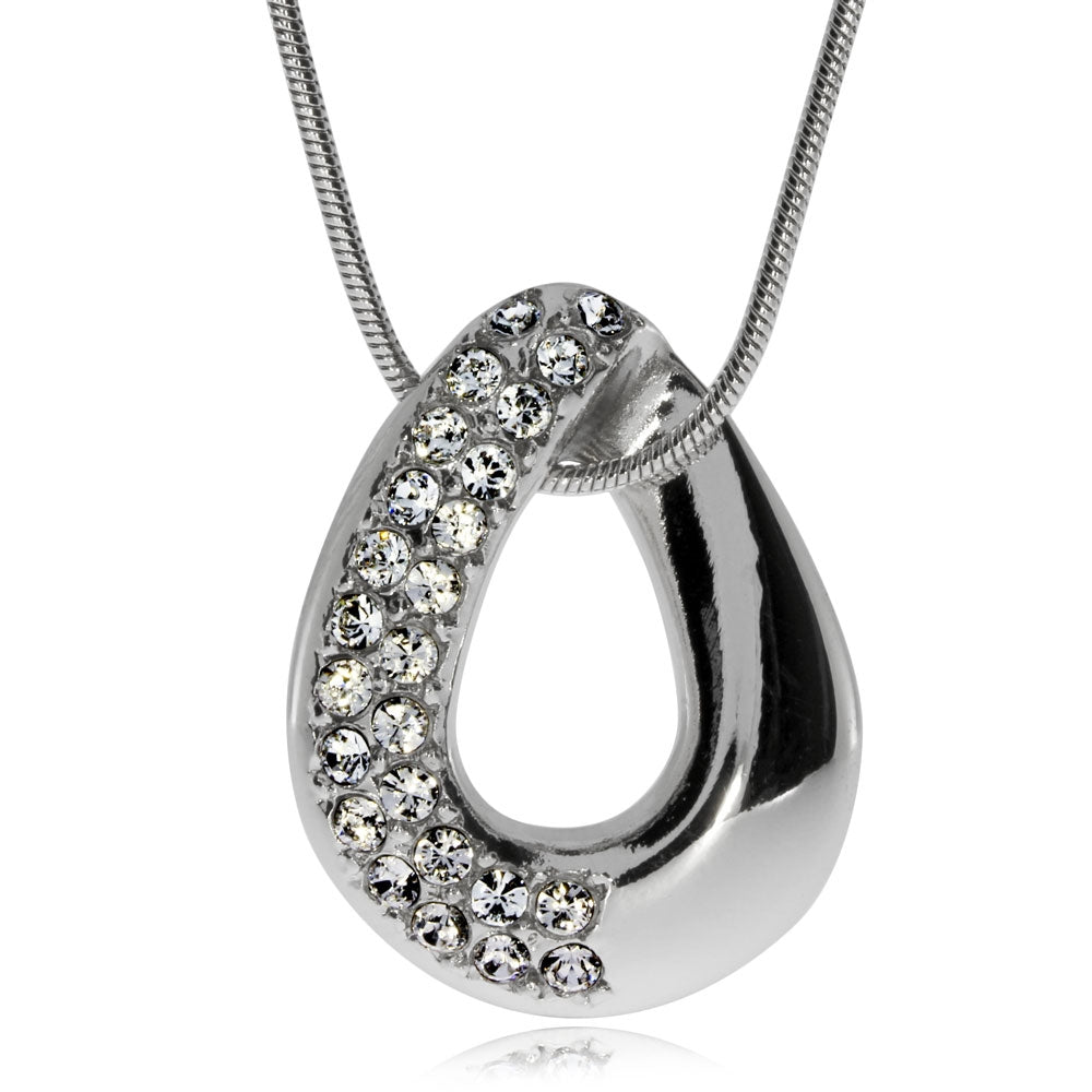 Velice krásně zpracovaný dámský bižuterní náhrdelník, který sestává z hladkého řetízku a elegantní ozdoby ve tvaru kapky. Na té skvěle vyniká zářivý rhodiovaný povrch, který je známý svou dobrou odolností, a zdobí ji osázení čirými křišťály Swarovski, které se jemně třpytí.