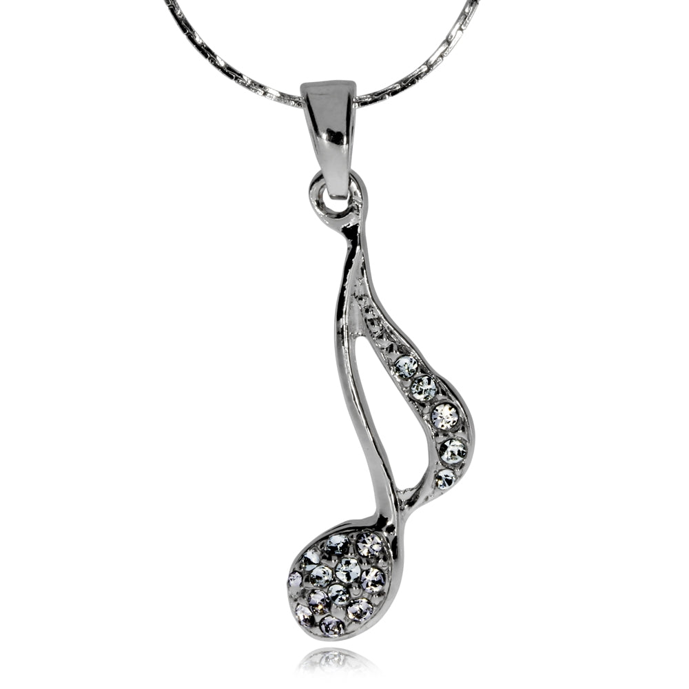 Velice krásně zpracovaný dámský bižuterní náhrdelník, který tvoří lesklý jednoduchý řetízek a třpytivá ozdoba ve tvaru noty, na které vyniká odolný rhodiovaný povrch. Nota je posetá čirými křišťály z dílny Swarovski.