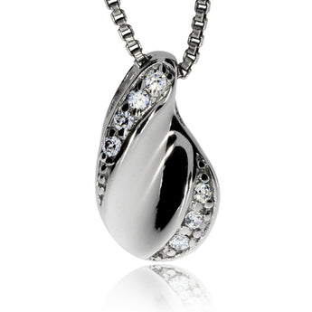 Osobitý a elegantní dámský přívěsek je vyrobený ze stříbra z rhodiovanou povrchovou úpravou. Ta kovu propůjčuje větší odolnost i lesk. Krásně hladká plocha je potom u tohoto šperku zajímavě oživená krásně třpytivými kameny (cubic zirconia), které jsou do něj zasazené. K tomuto přívěsku najdete v naší nabídce také odpovídající náušnice se stejným motivem.