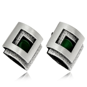 Originální dámské náušnice bodového typu, které zaujmou svým moderním a neotřelým zpracováním. Náušnice jsou vyrobené z kvalitního stříbra ve starostříbrné povrchové úpravě a v jejich středu spočívá kousek zeleného přírodního malachitu. Design tvoří dva přes sebe položené čtverce, jeden s čistým a druhý s ozdobným povrchem. Vzniká tak zajímavý efekt.