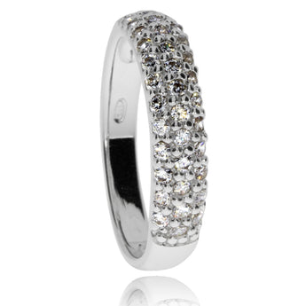 Půvabně jednoduchý a krásně zdobný prsten, který potěší každou ženu a dívku se zájmem v nadčasově elegantních špercích s nádechem luxusu. Jemný kroužek je vyrobený z odolného a působivě lesklého rhodiovaného stříbra. Jeho přední část je bohatě posetá syntetickými zirkony (cubic zirconia), které se překrásně třpytí.