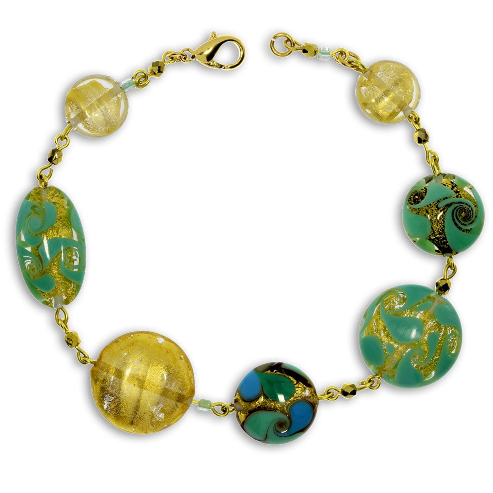 Bižuterní náramek ze skla - Tyrkysovo-zlaté vinuté perle