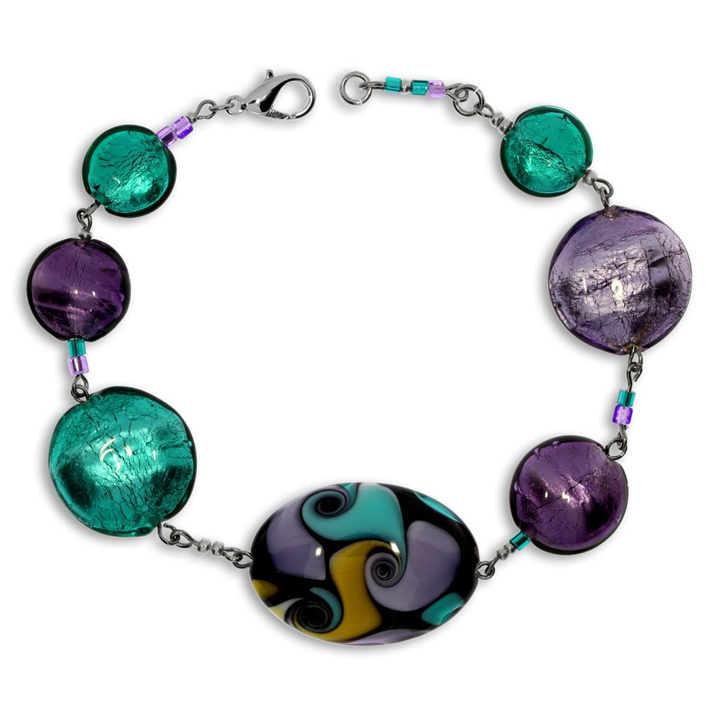 Bižuterní náramek ze skla - Tyrkysovo-fialové vinuté perle