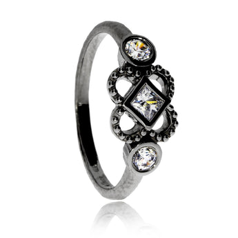 Nádherně zpracovaný dámský prsten z kolekce Allure, který upoutá svým netradičním zpracováním a luxusním designem. Prsten je skvělou volbou pro ženy a dívky, které rády vystupují z davu. Je vyrobený ze stříbra potaženého vrstvou odolného vzácného ruthenia, které barví povrch stříbra do tmava. Prsten nese tři čiré třpytivé zirkony (kubická zirkonie).