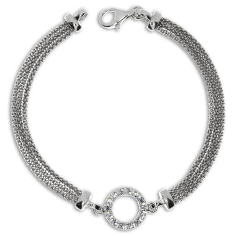 Půvabný náramek okouzlí každou dámu, která má zálibu v moderních elegantních špercích. Několik jemných řad doplňuje středová ozdoba ve tvaru kruhu, která je bohatě posetá syntetickými zirkony (cubic zirconia). Ty se vyznačují nádherným třpytem. Náramek je vyrobený z odolného a lesklého rhodiovaného stříbra.