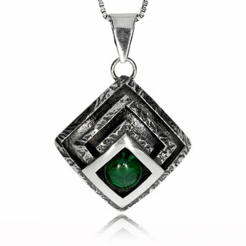 Dámský přívěsek z patinovaného stříbra má tvar čtverce s překrývajícími se čtvercovými liniemi a je zavěšen na koso. Zajímavým detailem designu je světlý čtvercový rámeček osazený kulatým kabošonem leštěného malachitu. Tento šperk je součástí sady shodného designu.
