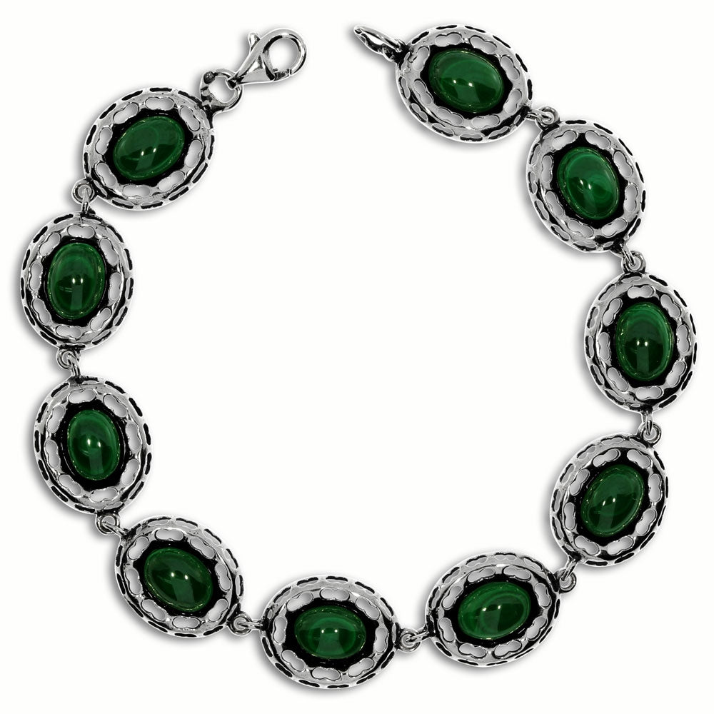 Stříbrný náramek pro ženy je složený z drobnějšíh oválných článků s malachitovými kabošony. Leštěné stříbro v kombinaci s temně zeleným přírodním malachitem je velmi působivé a efektní. Délka náramku je 20 cm a jeho zapínání je řešené karabinou.