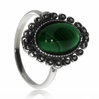Stříbrný prsten s oválným malachitem ozdobený starostříbrem