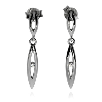 Originálně zpracované dámské visací náušnice, které upoutají pozornost svým elegantním designem a nápaditostí. Skvěle v nich vyniká rhodiovaný stříbrný povrch, který zanechává jednotlivé linie krásně vyhlazené a lesklé. Náušnice zdobí syntetický čirý zirkon (cubic zirconia).
