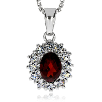 Překrásný přívěsek plný nepřehlédnutelného půvabu a jemného třpytu představuje skvostný šperk, který se hodí pro každou slavnostní příležitost i pro každodenní nošení k elegantním oděvům. Šperk nese oválně broušený granát almandin, který je ozdobený třpytem okolních syntetických zirkonů (cubic zirconia) čiré barvy. Přívěsek je vyrobený z odolného rhodiovaného stříbra a spolu s ním najdete v naší nabídce také náušnice se stejným motivem.