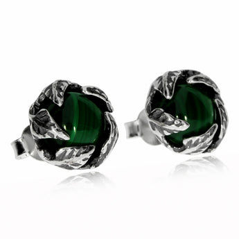 Dámské stříbrné náušnice pecky kulatého tvaru nesou ve svém středu leštěný přírodní malachit. Kouzelný zelený minerál je sevřen ozdobami z drobných lístků. Náušnice mají jednoduché zapínání na puzety a jsou součástí soupravy šperků se shodným designem.