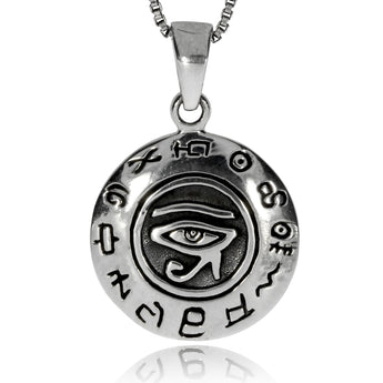 Pěkně zpracovaný přívěsek nese prastarý motiv odkazující na egyptského boha Hora. Tomu se podařilo pomocí svého oka oživit Osirise, a tento symbol tak představuje znovzrození a pevné zdraví. V minulých dobách se tak používal při léčebných rituálech. Kruhový přívěsek je zpracovaný ve starostříbrné povrchové úpravě.